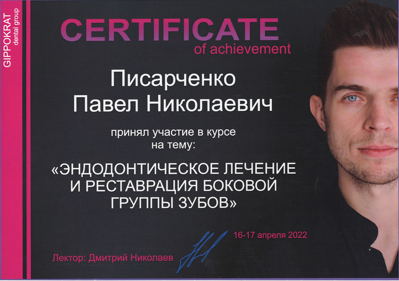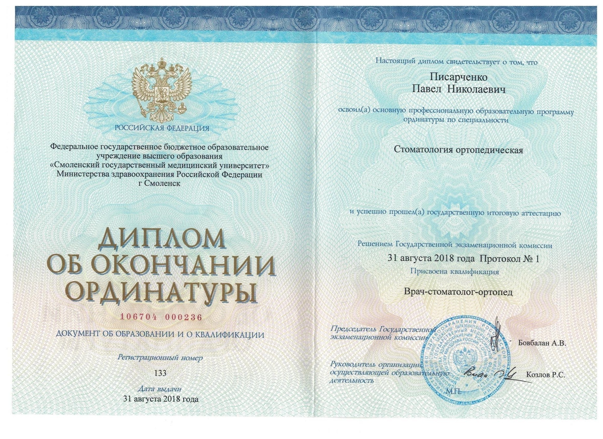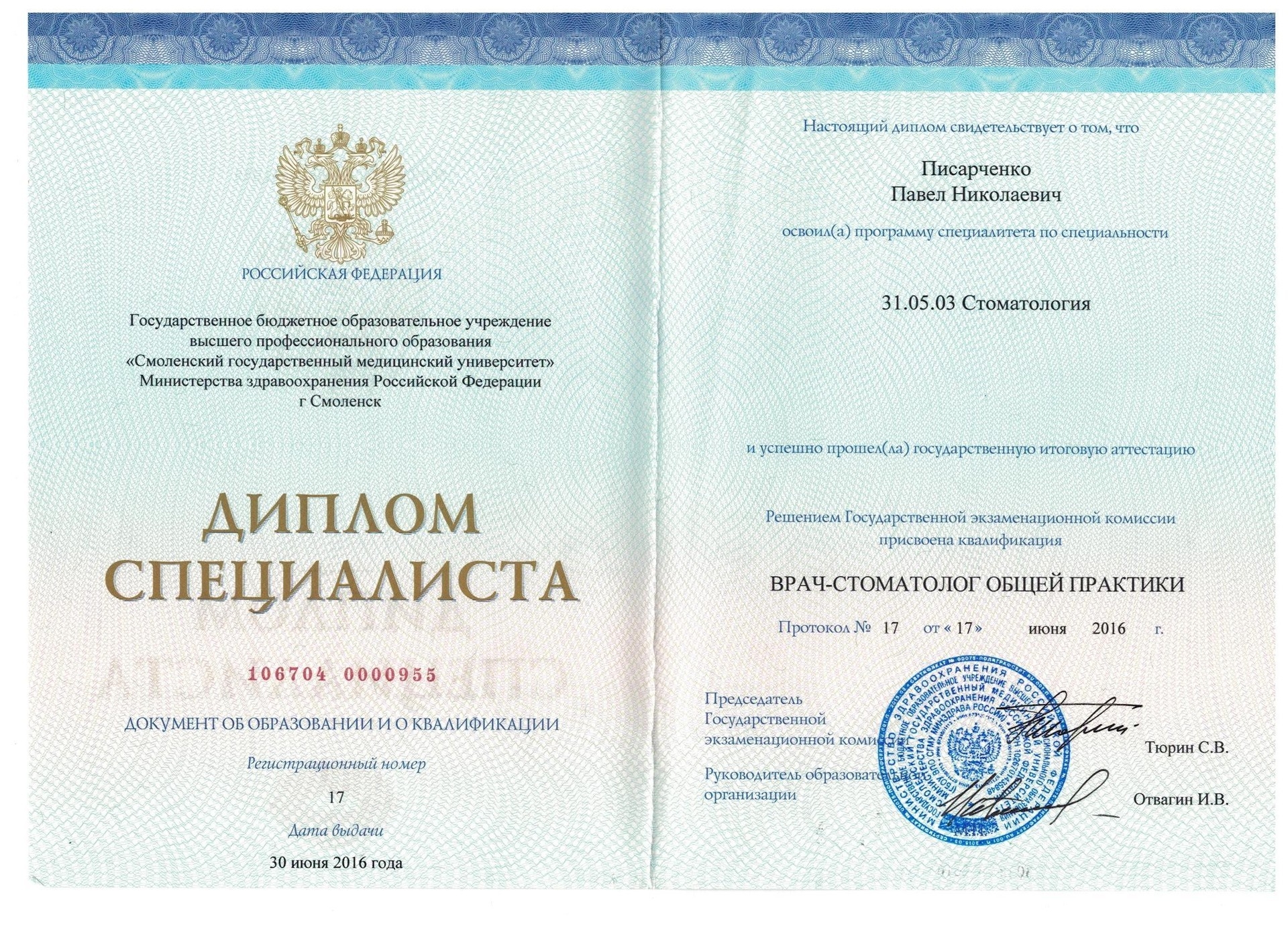 2016 год. Окончил «Смоленский государственный медицинский университет» Специальность «Стоматология» Квалификация Врач-стоматолог общей практики