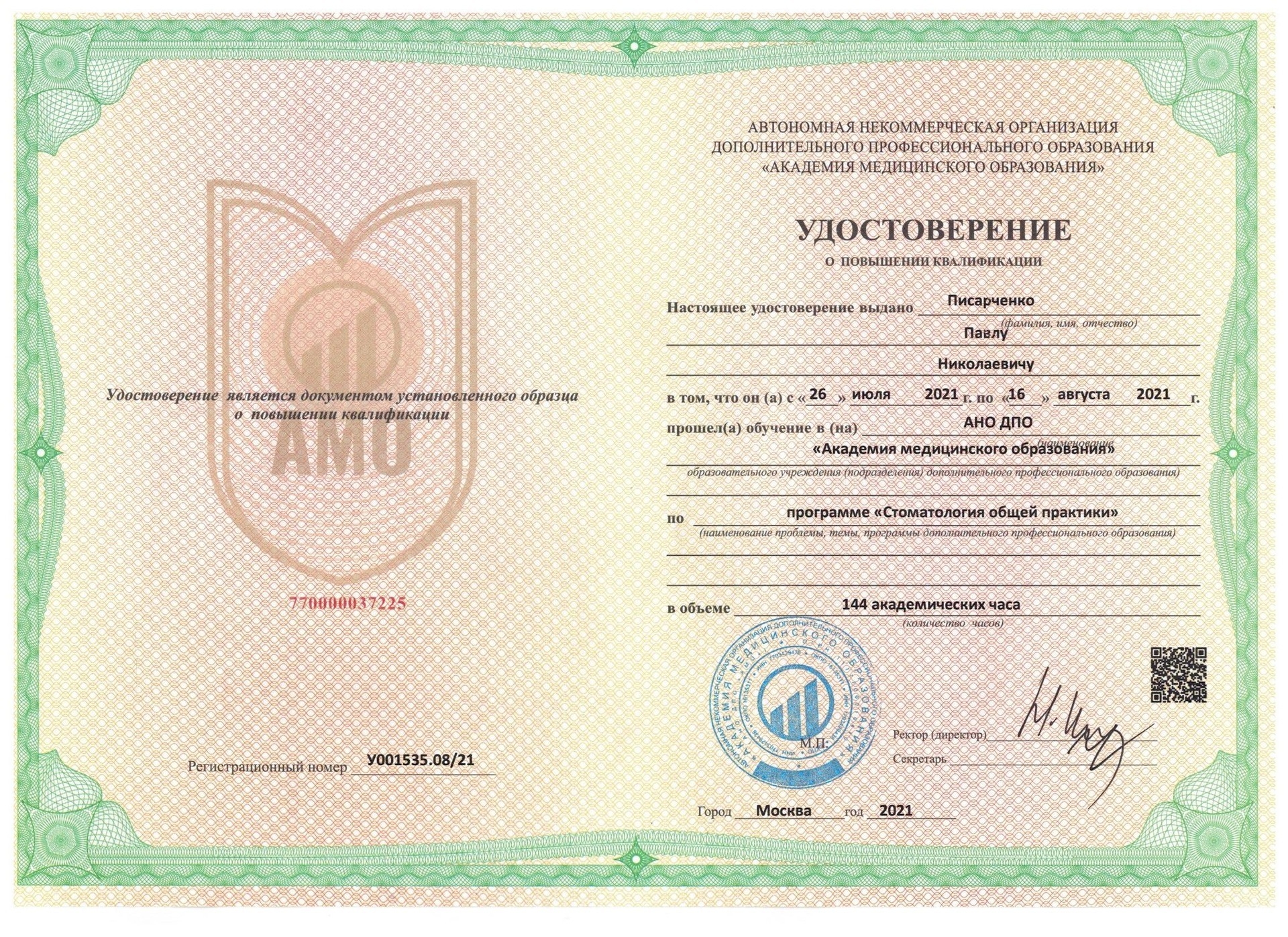 2021 год. Удостоверение о повышении квалификации «Стоматология общей практики»