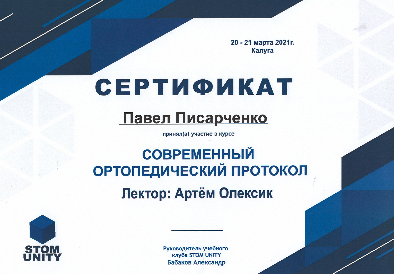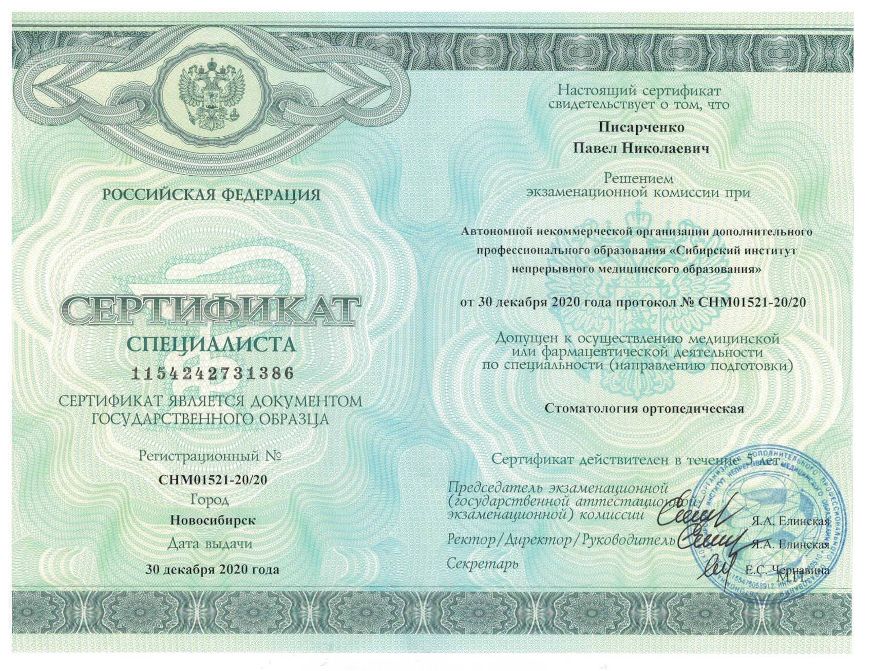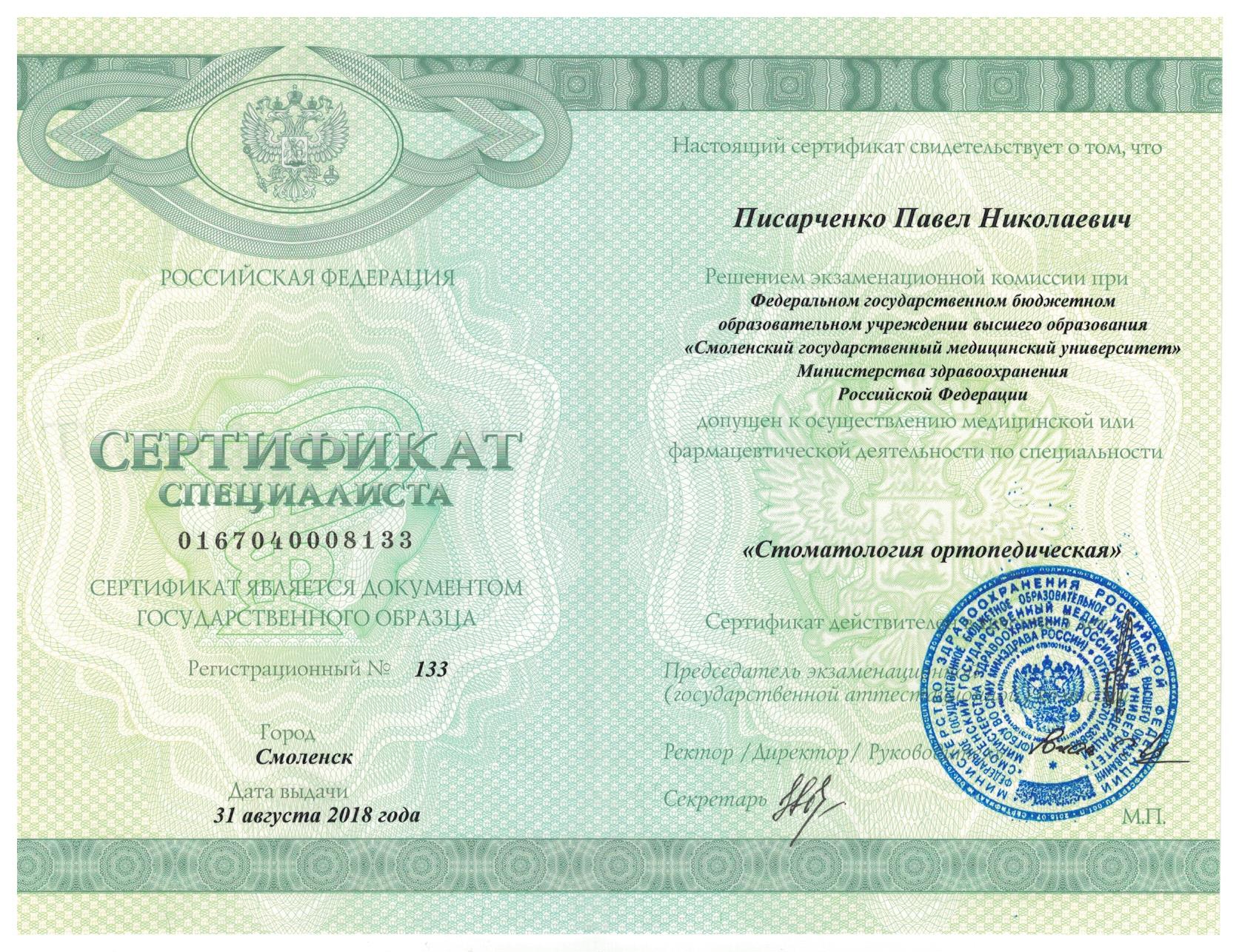 2018 год. Сертификат специалиста. «Стоматология ортопедическая»