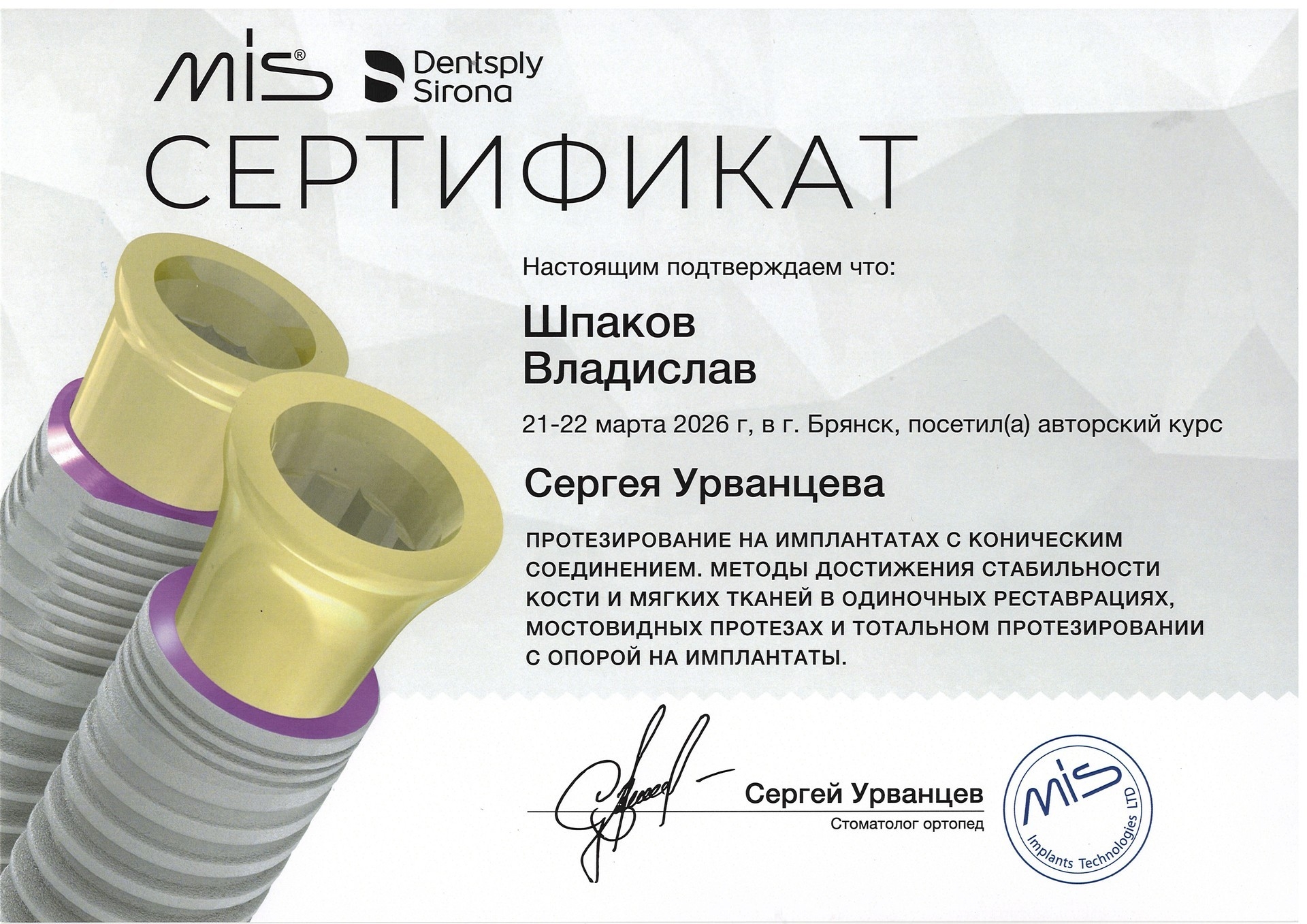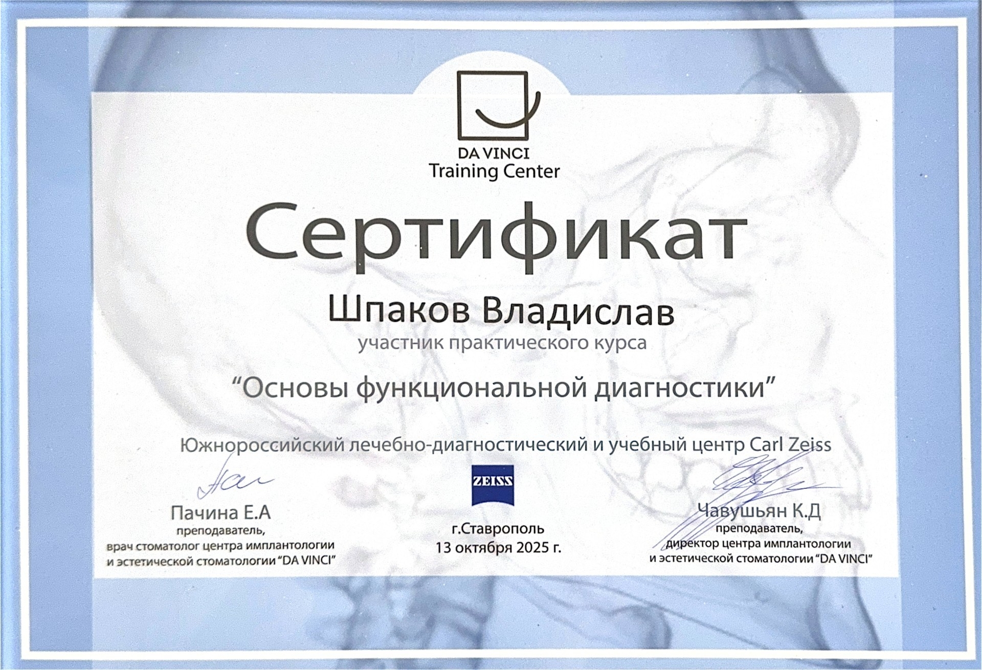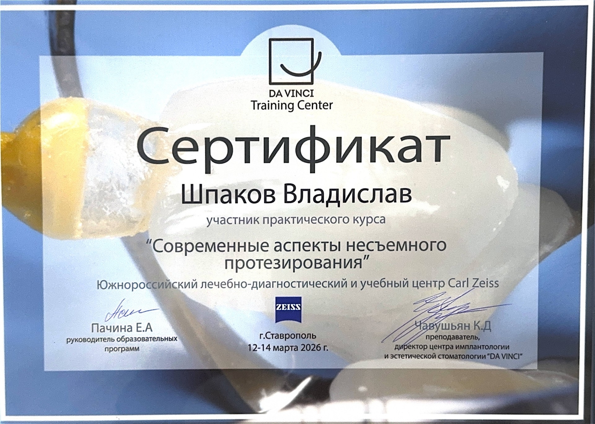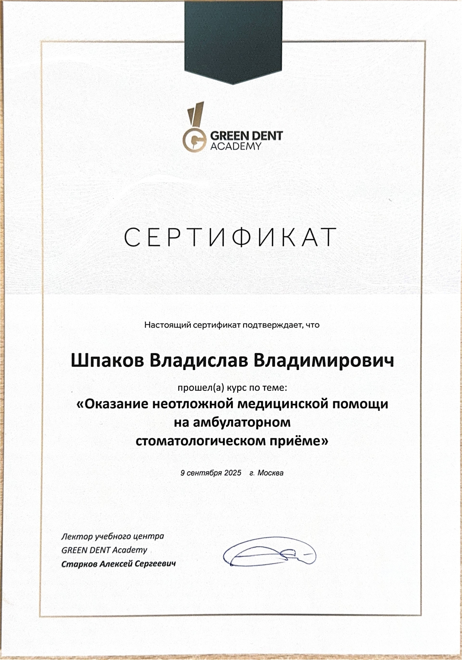 2024 год. Окончил «Курский государственный медицинский университет» Министерства здравоохранения Российской Федерации г. Курск. Специальность «Стоматология общей практики»